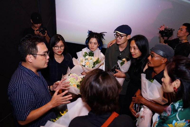 Top 5 thí sinh và các giám khảo (đạo diễn Phan Đăng Di, đạo diễn Nguyễn Hoàng Điệp, nhà sản xuất Trần Thị Bích Ngọc) trong đêm bế mạc Dự án phim ngắn CJ mùa 3