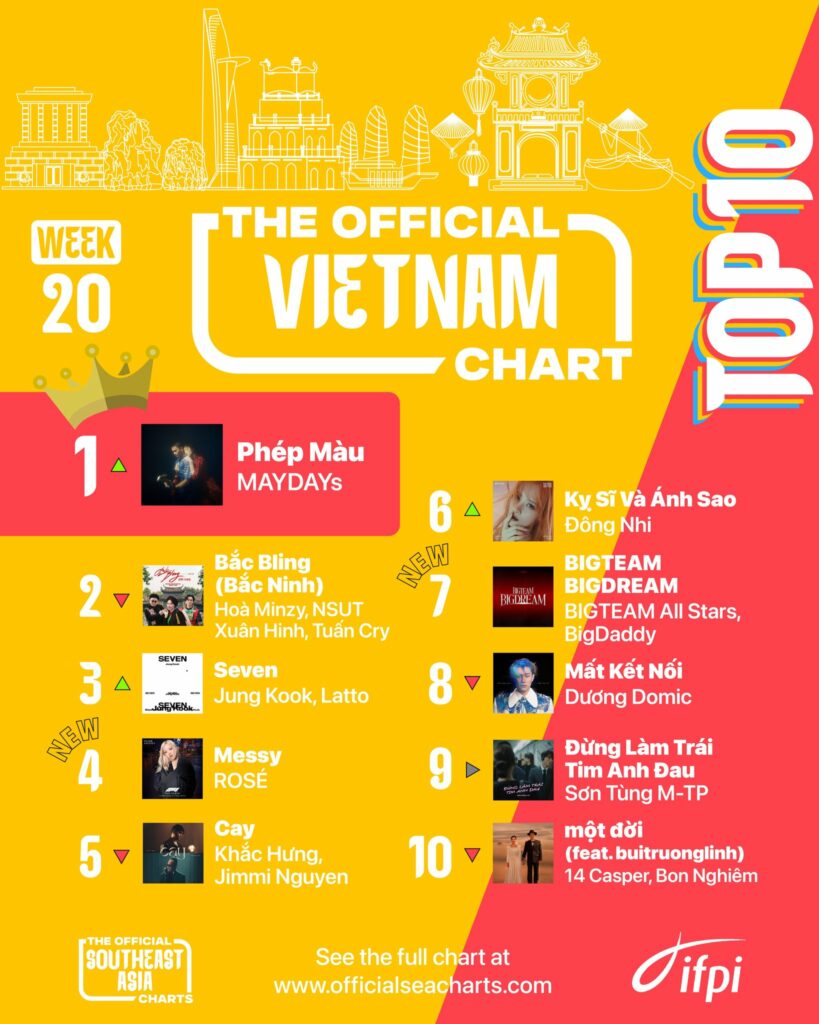 Theo thông tin từ The Official Vietnam Chart (Bảng xếp hạng chính thức tại Việt Nam), “Phép Màu” (MAYDAYs, Minh Tốc) là ca khúc dẫn đầu tuần 20, chính thức soán ngôi đầu bảng của loạt hit Việt Nam lẫn quốc tế như “Bắc Bling” (Hòa Minzy, NSUT Xuân Hinh, Tuấn Cry), Seven (Jung Kook, Latto)…