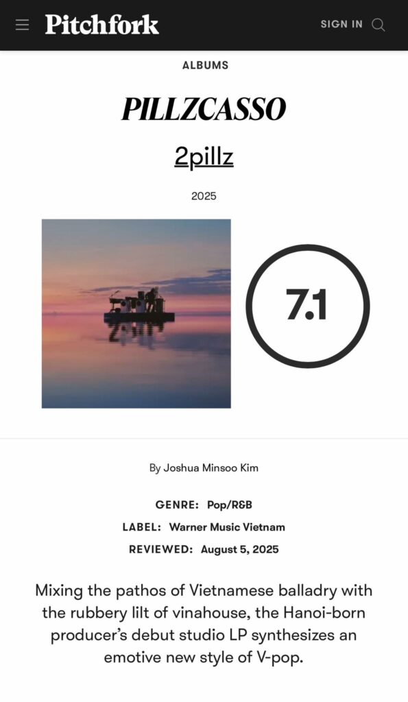 Sáng ngày 5/8, một trong những chuyên trang âm nhạc hàng đầu thế giới Pitchfork đã đăng tải bài viết đánh giá album PILLZCASSO của 2pillz. Đặc biệt, album được chấm 7,1 điểm – một con số ấn tượng đối với chuyên trang âm nhạc nổi tiếng khó tính như Pitchfork. Trong bài viết, chuyên gia phê bình Joshua Minsoo Kim cũng dành nhiều lời khen cho album PILLZCASSO, đánh giá cao chất việt mà 2pillz đưa vào từng ca khúc và ưu ái gọi đây là “tuyên ngôn âm nhạc mạnh mẽ nhất của Vpop năm nay”.