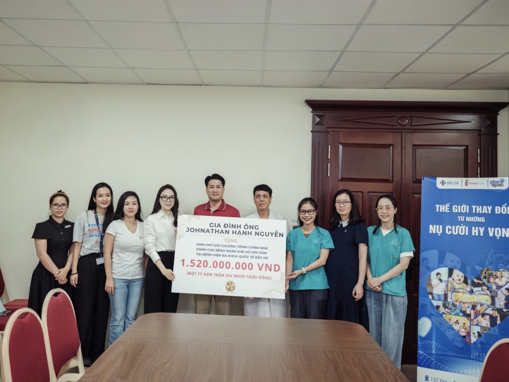 Vừa qua, gia đình doanh nhân Johnathan Hạnh Nguyễn cùng Công ty TNHH PTE APAC đã trao tặng hơn 1,5 tỷ đồng cho tổ chức Smile Train thông qua Bệnh viện đa khoa Quốc tế (ĐKQT) Bắc Hà. Khoản tài trợ nhằm hỗ trợ phẫu thuật và điều trị miễn phí cho các em nhỏ mắc dị tật khe hở môi – vòm miệng.