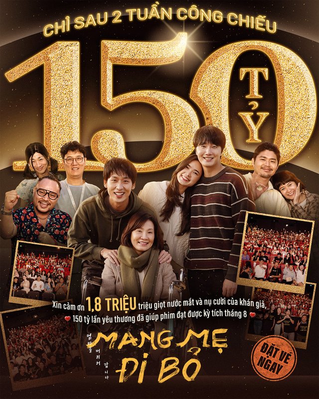 Tối 14/8, bộ phim hợp tác Việt – Hàn Mang Mẹ Đi Bỏ chính thức cán mốc 150 tỷ đồng doanh thu chỉ sau 2 tuần công chiếu. Đây cũng là bộ phim Việt đầu tiên trong lịch sử đạt được thành tích này vào tháng 8 – thời điểm vốn được xem là mùa thấp điểm của điện ảnh trong năm khi không có ngày lễ lớn để kéo khán giả ra rạp.