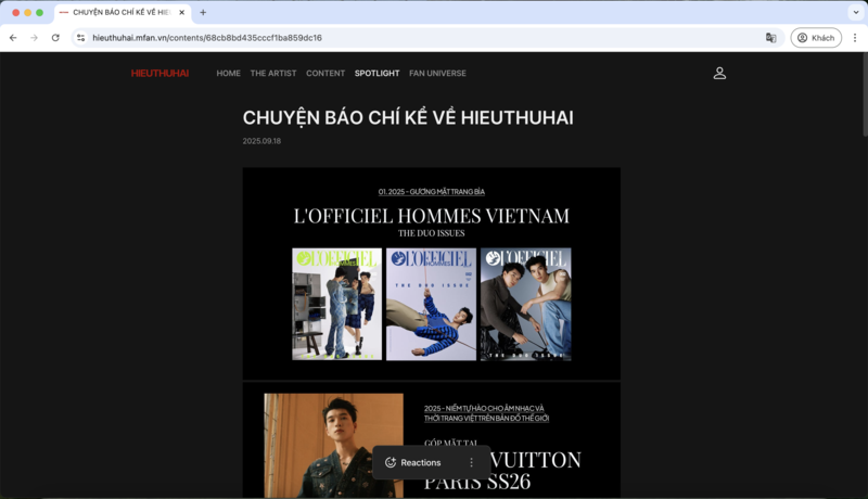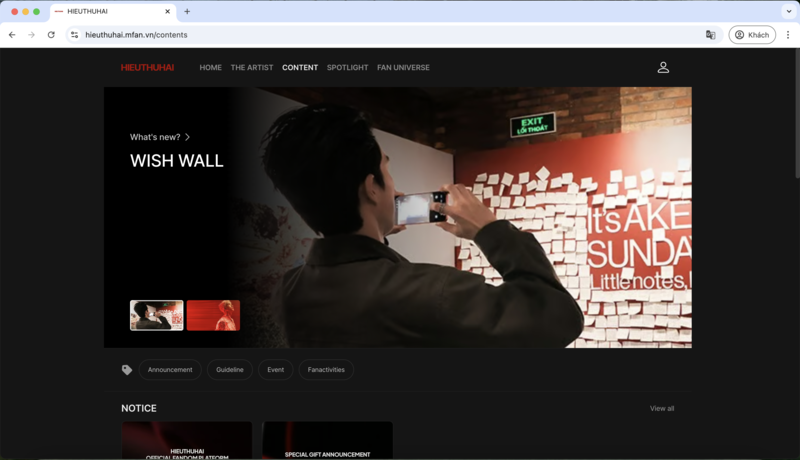 Giao diện của Fandom Platform tại <hieuthuhai.ai> gây ấn tượng bởi thiết kế trực quan, dễ dàng tiếp cận và sử dụng dành cho tất cả người hâm mộ. Ở trang “The Artist”, khán giả có thể nhìn lại hành trình và âm nhạc của HIEUTHUHAI, từ các sản phẩm đã phát hành cùng thành tích nhạc số ấn tượng cùng nhiều giải thưởng cho đến vai trò đại sứ thương hiệu hay hình ảnh thời trang nổi bật. Trong trang “Content”, người hâm mộ được cập nhật nhanh chóng các thông báo chính thức từ HIEUTHUHAI, đặc biệt là một số nội dung độc quyền chỉ có trên Fandom Platform. Đến trang “Spotlight”, người hâm mộ sẽ đón đọc những thông tin thú vị xoay quanh HIEUTHUHAI. Cuối cùng, trang “Fan Universe” là nơi người hâm mộ nhìn lại những khoảnh khắc đáng nhớ cùng thần tượng như các Fan Project, Fan Meeting,…