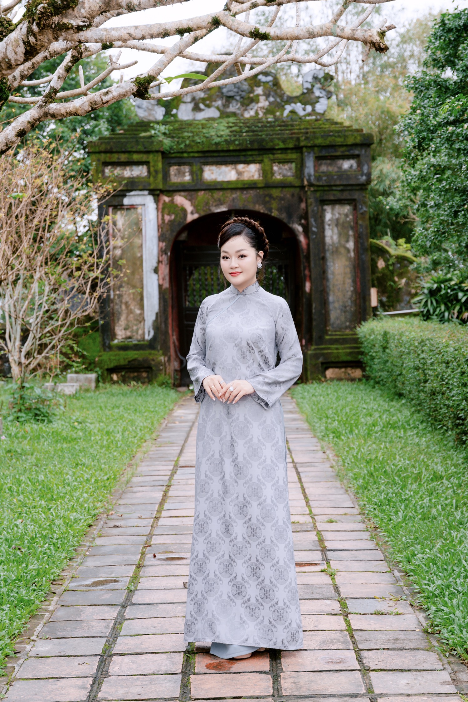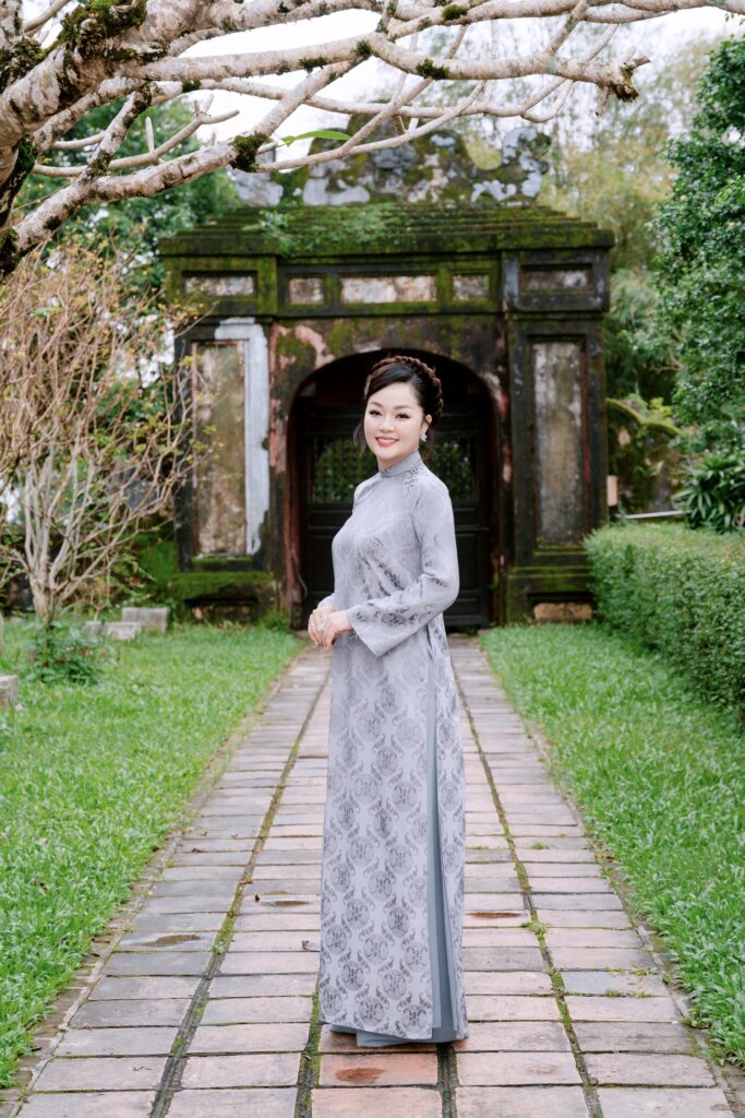 Trong sắc xám dịu nhẹ của bộ áo dài, Hoàng Thanh Nga chọn phong thái tối giản nhưng tinh tế, để mỗi đường nét uyển chuyển hòa vào kiến trúc bảy tầng đặc trưng của tháp Phước Duyên. Không cầu kỳ phụ kiện, không phô trương, nàng hậu để sự thanh tao tự nhiên của mình trở thành điểm nhấn giữa bối cảnh xanh trầm – cổ kính, tạo nên một khung ảnh đẹp tựa tranh.