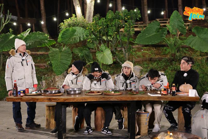 Trong khi đó, ở một diễn biến, 2 chị em “Tấm – Cám” Cris Phan và Dương Lâm cũng kiếm chuyện bày trò. Trong lúc các anh em nhóm thêm một nồi than bên này, Cris Phan cũng rủ Dương Lâm “sơn đông mãi võ” phun lửa phèo phèo. Dương Lâm cũng hài hước tung hứng làm theo. Ngô Kiến Huy còn không quên “hùa” theo mời Cris Phan trổ tài “nuốt than”. Cứ thế chưa vô bữa chính mà mấy anh em đã rộn ràng một góc trời.