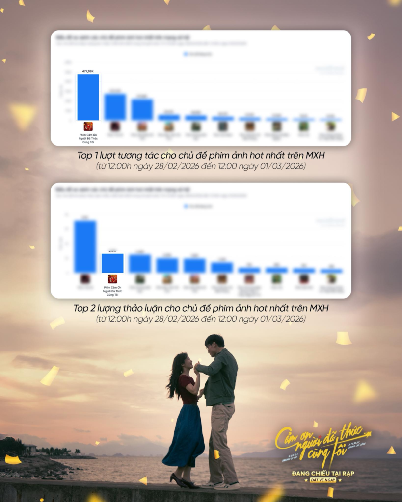 Song song với tín hiệu khả quan tại phòng vé, Cảm Ơn Người Đã Thức Cùng Tôi còn “gây bão” mạng xã hội khi vươn lên Top 1 lượt tương tác chủ đề phim ảnh trong ngày 1/3 với gần 500.000 lượt theo thống kê từ Social Trend. Phát huy lợi thế âm nhạc, các ca khúc và trích đoạn âm thanh của phim cũng nhanh chóng bùng nổ trên nhiều nền tảng, góp phần gia tăng độ nhận diện và sức nóng của tác phẩm đến đông đảo khán giả.
