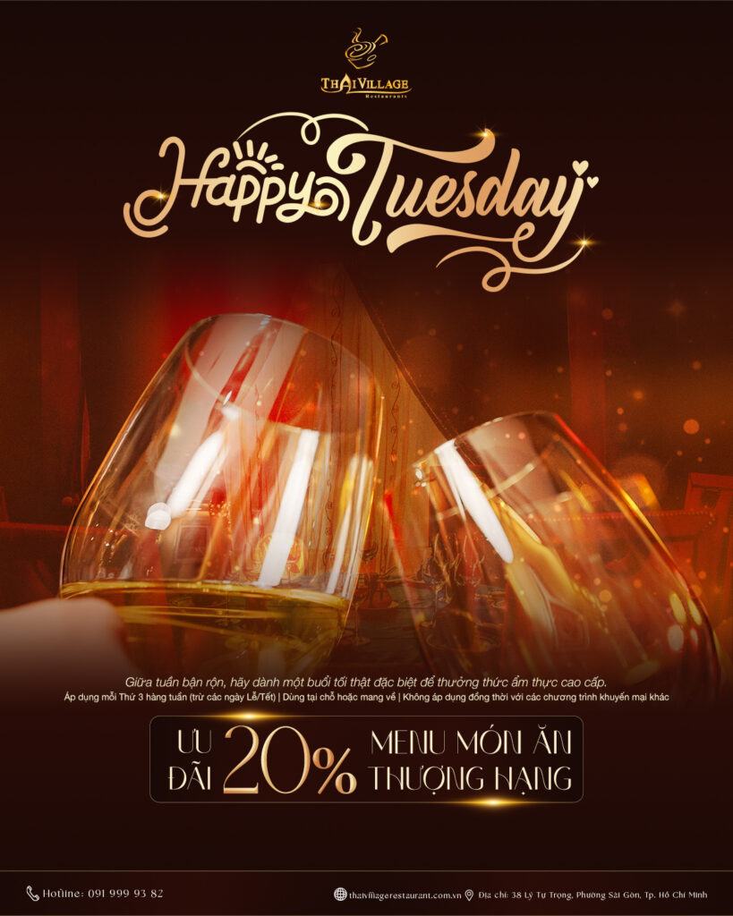 Trong khi nhiều nhà hàng tập trung vào cuối tuần, Thai Village lại tạo điểm nhấn với chương trình Happy Tuesday – ưu đãi dành cho ngày thứ Ba.